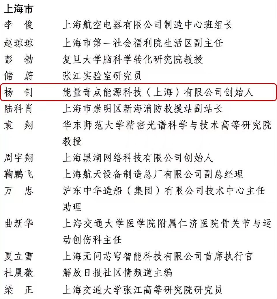 近日,共青团中央公示了“2026年度中国青年五四奖章暨新时代青年先锋奖”,能量奇点创始人杨钊入围新时代青年先锋奖。据了解,中国青年五四奖章暨新时代青年先锋奖是共青团中央、全国青联授予中国优秀青年的最高荣誉,旨在树立政治进步、品德高尚、贡献突出的优秀青年典型,集中反映新时代中国青年的精神品格和价值追求。