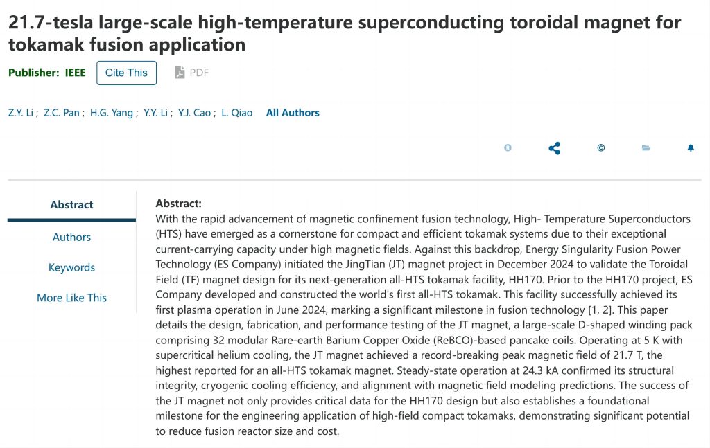 A peer-reviewed paper detailing the Jingtian magnet, titled "21.7-tesla large-scale high-temperature superconducting toroidal magnet for tokamak fusion application," was recently published in IEEE Transactions on Applied Superconductivity (IEEE TAS). The paper presents the design, fabrication, and performance testing of this large-scale magnet, which features a D-shaped winding pack comprising 32 modular Rare-Earth Barium Copper Oxide (ReBCO) pancake coils.