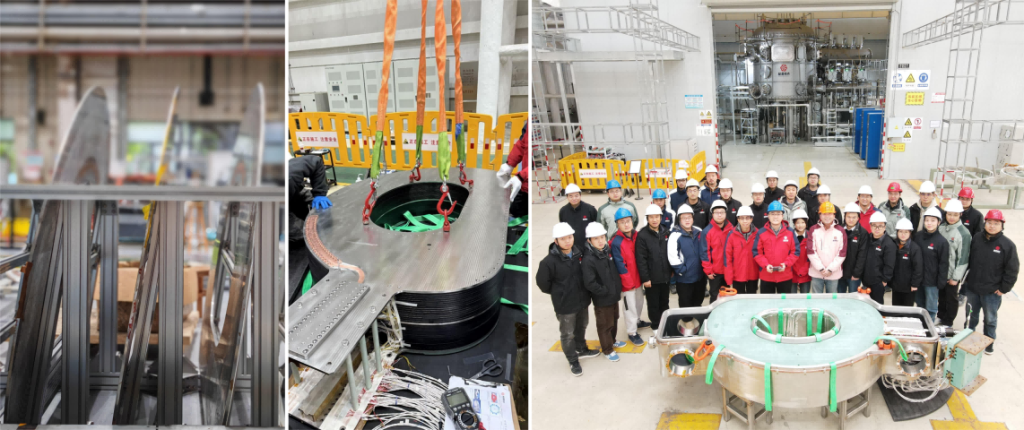 The Jingtian magnet is a D-shaped HTS magnet, with a linear size of approximately 3 meters by 1.4 meters, and a total weight of about 7.5 tons. Its innovative design features a winding pack meticulously assembled from 32 stacked single-pan coils, with a center bore of 0.5 square meters. In this test, a electrical current of 24,300 amperes (per turn) passed through the winding pack via ReBCO current leads, to produce a peak field of 21.7 tesla. The total ampere-turns of the magnet reached 9.26 megaamperes-turns, with a current density of 157 megaamperes per square meter in the winding pack.