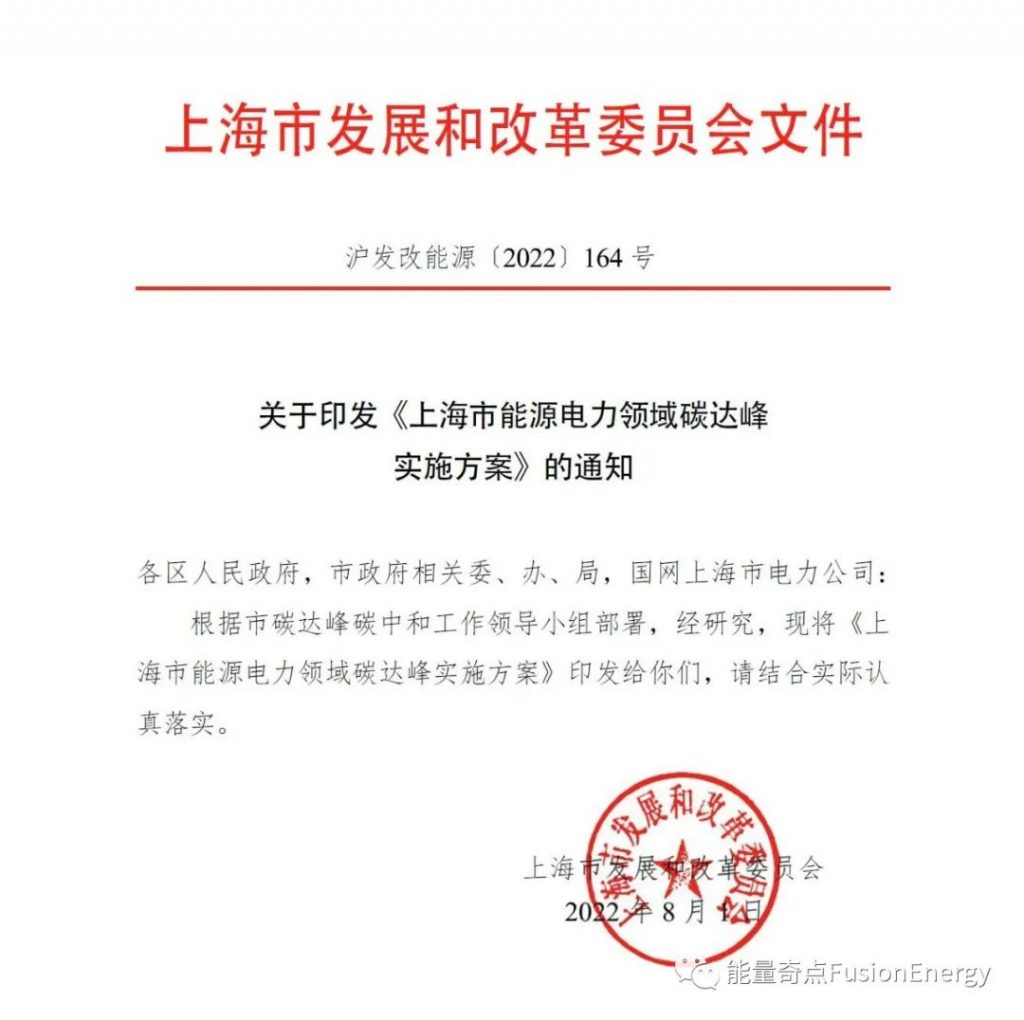 近日,上海市发改委印发《上海市能源电力领域碳达峰实施方案》,方案提出:
